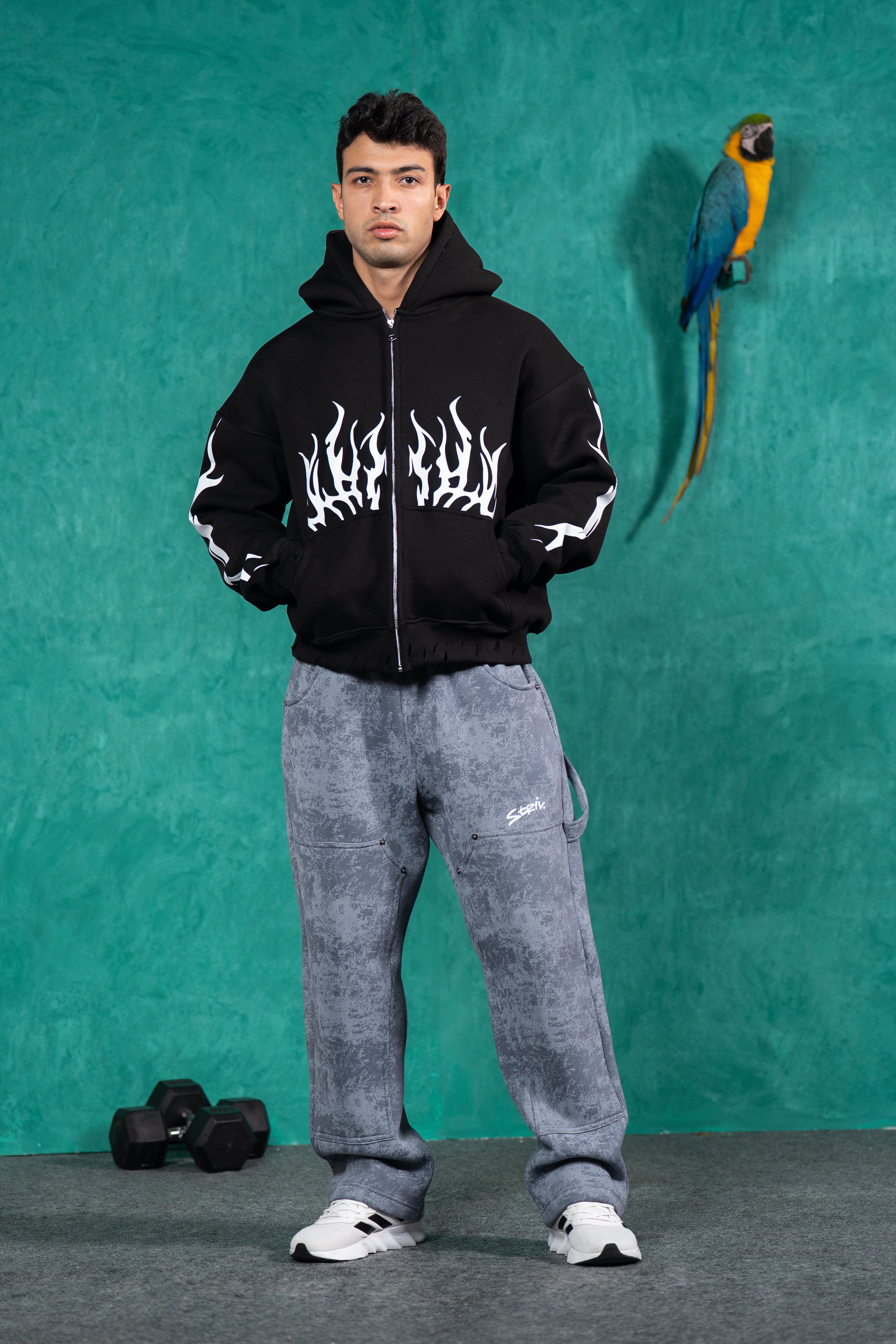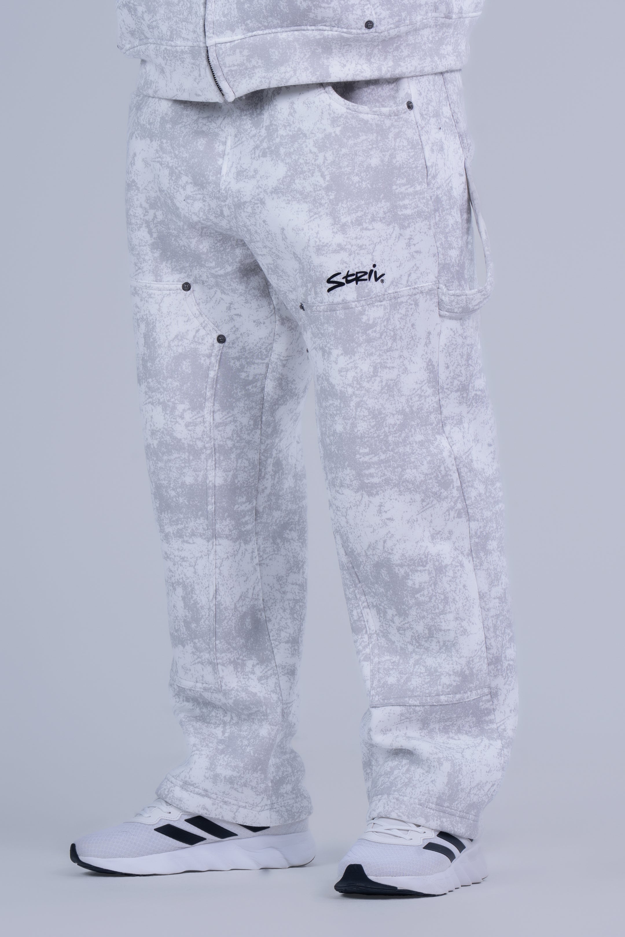 The joggers include stylish panel details with metal stud accents and a clean white logo on the thigh, enhancing their modern and urban look. With a flexible waistband and roomy legs, they deliver the perfect blend of comfort, durability, and style.